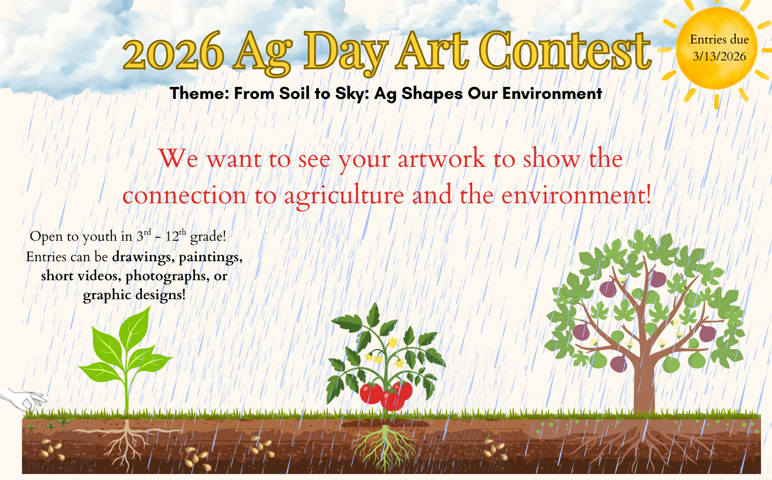 The theme for 2026 is “From Soil to Sky: Ag Shapes our Environment” This is an opportunity for students to learn about Agriculture as a leading industry and how it can impact our lives. Agriculture connects every part of our world – from the ground beneath our feet to the open skies above us. This theme invites you to explore how farming, ranching, natural resources, and food production impact our environment, our communities, and our future. Think of the journey: seeds planted in the soil, crops growing toward the sky, animals and ecosystems working together, farmers using technology, and the way agriculture sustains life on Earth. You’re encouraged to show this connection in any style, any mood, and from any viewpoint – realistic, abstract, futuristic, or personal.